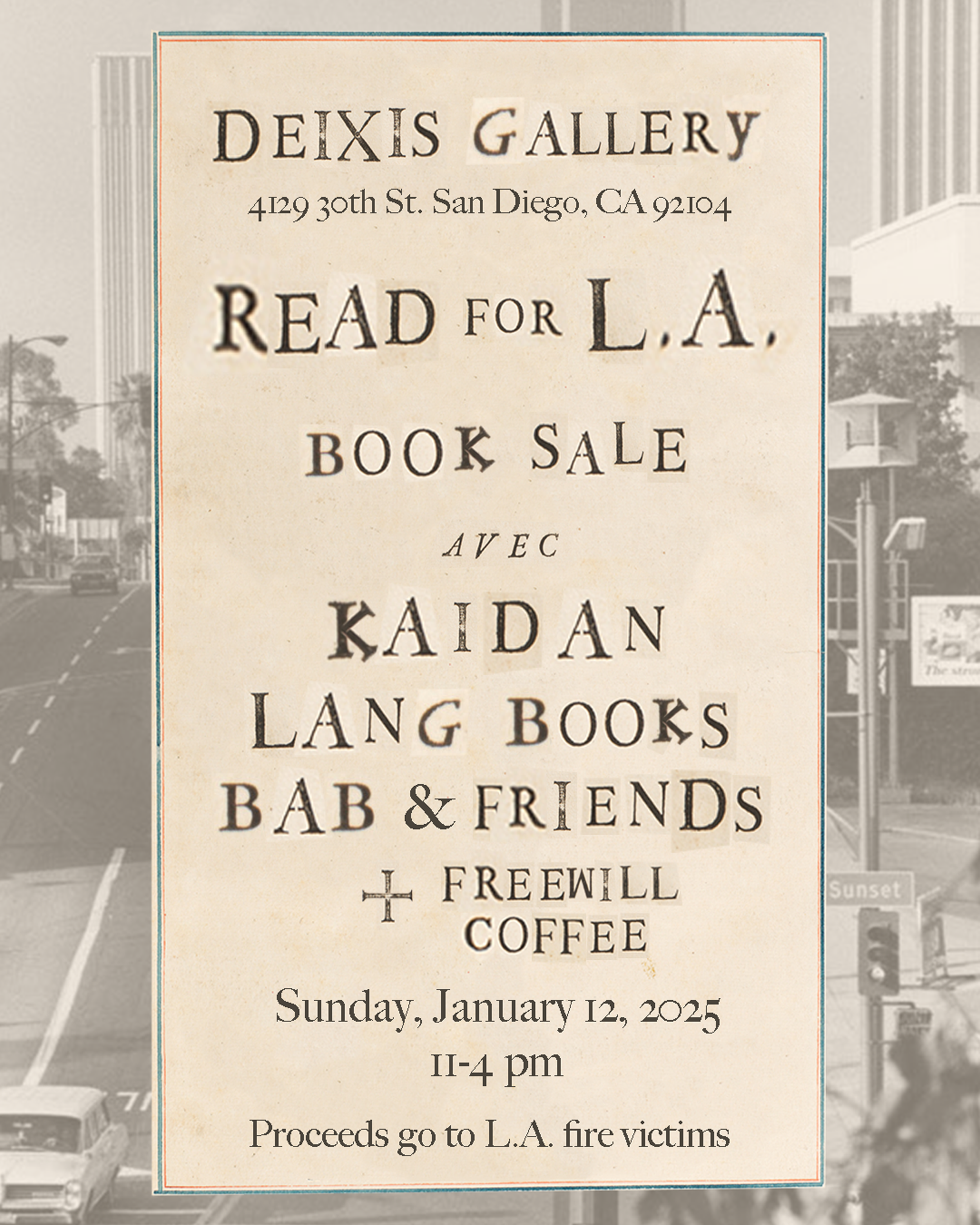 On Sunday, January 12th from 11-4 PM at Deixis Gallery, we’ll have a book sale with some of our great friends Lang Books, Kaidan Pascua, and BAB & Friends.